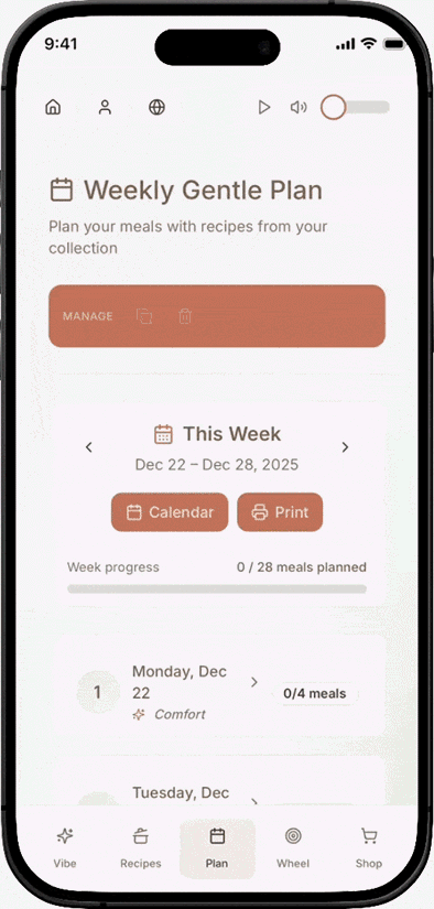 A visual weekly planner that respects your rhythm. Add meals anywhere in your day, adjust serving sizes, and include personal notes for each day.