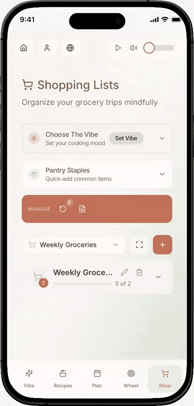 With a single tap, your meal plan becomes a calm, organized shopping list, arranged by zones, while being mindful of your budget.